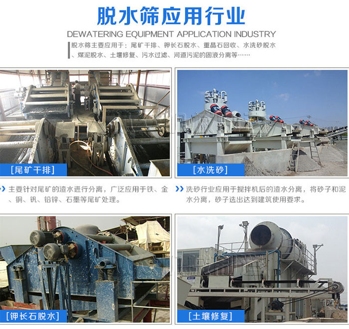 脫水篩是煤泥脫水作業(yè)的專用振動(dòng)篩,它廣泛適用于選煤、電力、選礦、制鹽、化工、制糖等行業(yè)中的細(xì)粒度干式、濕式篩分煤泥回收,過濾隔粗、壓濾隔粗、其他極細(xì)物料的脫水、過濾隔粗脫水、脫介、脫泥回收等工藝中。