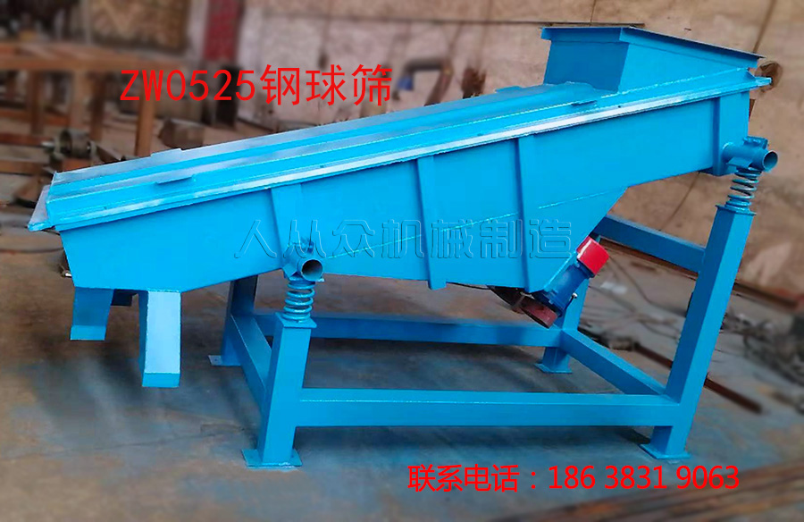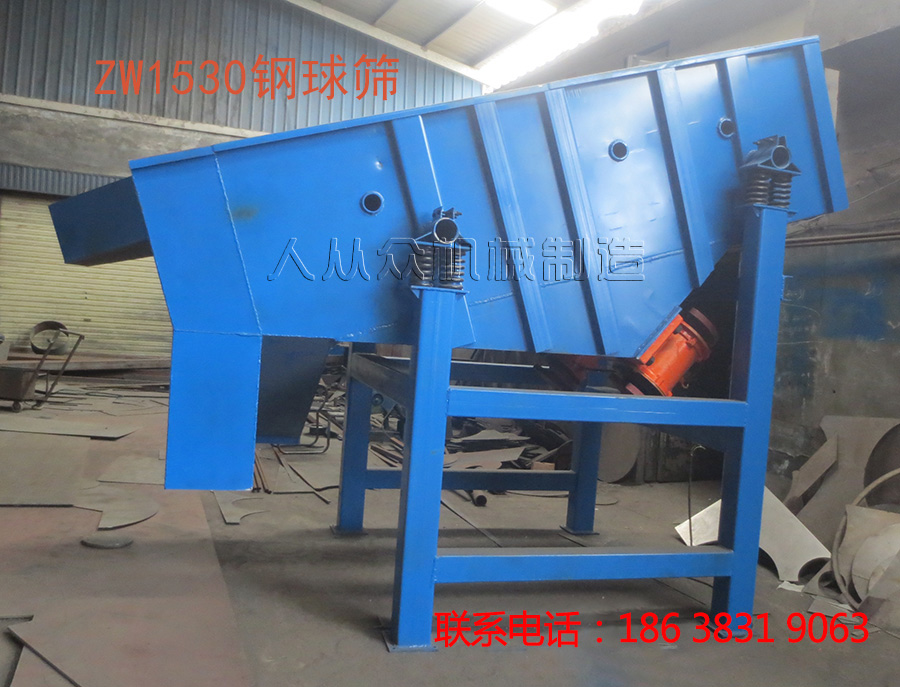 ZW鋼球挑選機主要由箱體、篦子、激振源、臺座、減振彈簧、支架組成。ZW鋼球挑選機是雙激震源驅動。當兩臺激震源做同步、反向運轉時,其偏心塊所產生的激振力在平行于激震源軸線的方向相互抵消,在垂直于激震源軸的方向疊為一合力,因此鋼球(鋼段)在鋼球挑選機上的運動軌跡為直線向前做拋物線運動。兩激震源軸相對箱體有一傾角在激振力和鋼球(鋼段)自重力的合力作用下鋼球(鋼段)在篦子上被拋起跳躍式向運動,從而達到對鋼球(鋼段)進行挑選和分級的目的。