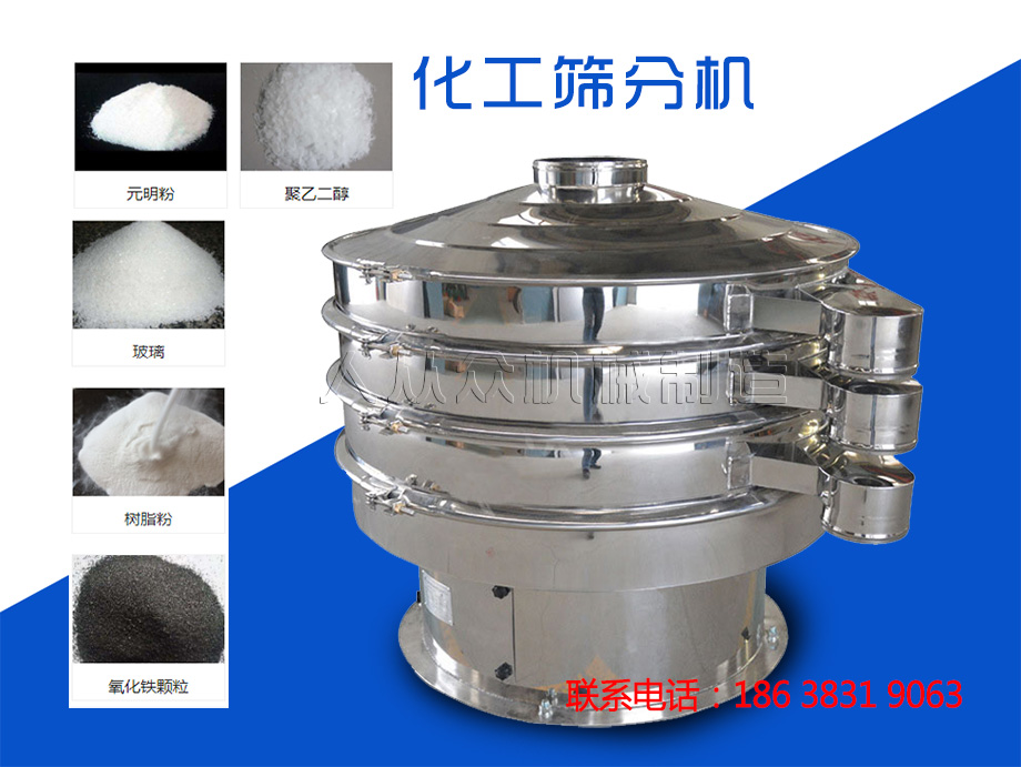 化工振動(dòng)篩是篩面直徑為400-2000mm的篩分設(shè)備,常被稱為篩分機(jī)、篩粉機(jī)、振蕩篩等,它采用上、下兩端安裝有偏心重錘的立式振動(dòng)電機(jī)作為激振源,將電機(jī)旋轉(zhuǎn)而來(lái)的水平、垂直、傾斜的三次元運(yùn)動(dòng)傳給篩面,作用于物料。