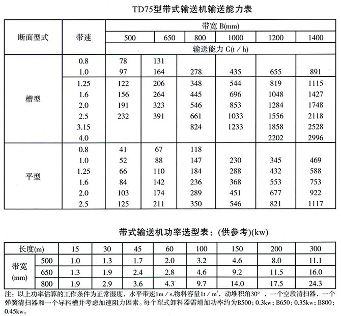TD75型通用固定帶式輸送機(jī)輸送能力表: