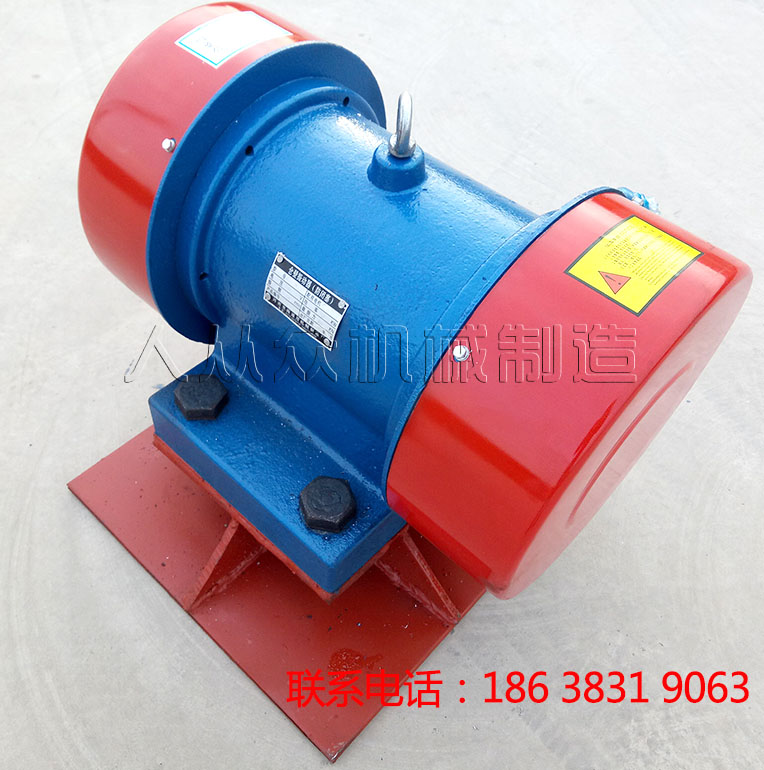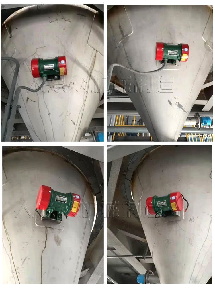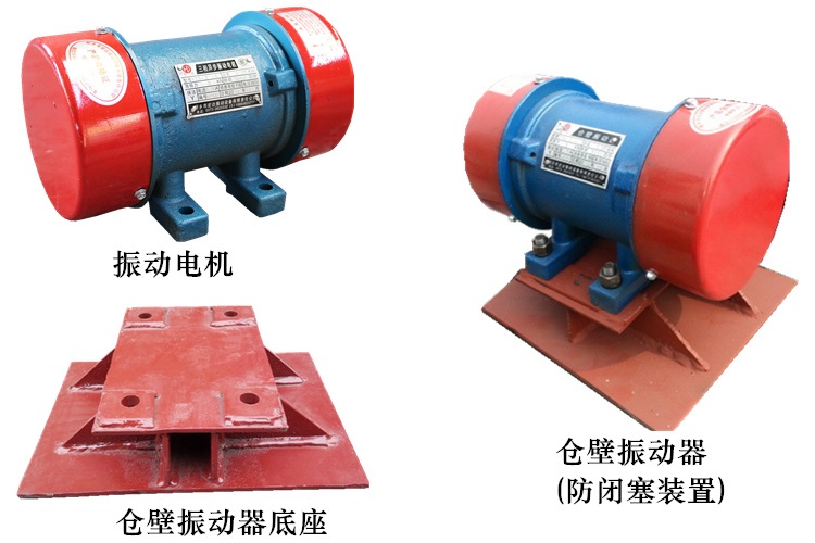 由振動電機、底座兩部分組成。振動電機和底座由螺栓緊密地固定為一體,由于底座堅固地安裝在料倉壁上,這樣就構(gòu)成了單質(zhì)點定向振動系統(tǒng)。當防閉塞裝置工作時,振動電機的高速轉(zhuǎn)動,便產(chǎn)生了對料倉壁的周期性高頻振動,由于防閉塞裝置的周期性振動,一方面使物料與倉壁脫離接觸、消除物料與倉壁的摩擦,另一方面使物料受交變速度和加速度的影響,處于不穩(wěn)定狀態(tài),從而有效地克服物料的內(nèi)摩擦力和聚集力,以消除料倉內(nèi)物料間的相對穩(wěn)定性,使物料從料倉口順利排出。