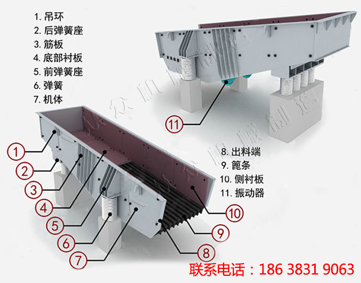 ZSW振動(dòng)給料機(jī)主要由振動(dòng)機(jī)架、彈簧、振動(dòng)器、電機(jī)振動(dòng)架及電機(jī)等組成。激振器個(gè)是由二特定位置的偏心軸以齒輪相嚙合組成,裝配時(shí)必須使兩齒輪按標(biāo)記相嚙合,通過(guò)電機(jī)驅(qū)動(dòng),使兩偏心軸旋轉(zhuǎn),從而產(chǎn)生巨大合成的直線激振力,使機(jī)體在支承彈簧上作強(qiáng)制振動(dòng),物料則以此振動(dòng)為動(dòng)力,在料槽上作滑動(dòng)及拋擲運(yùn)動(dòng),從而使物料前移而達(dá)到給料目的。當(dāng)物料通過(guò)槽體上的篩條時(shí),較小的料可通過(guò)篩條間隙而落下,可不經(jīng)過(guò)下道的破碎工序,起了篩分的效果,提高了工作效率。