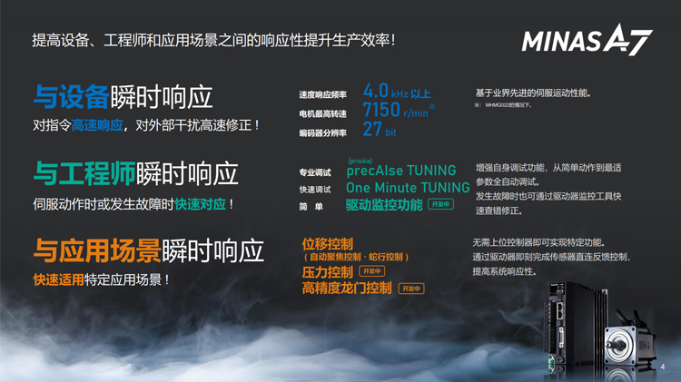 伺服智能化優(yōu)化人機(jī)作業(yè),智能化伺服可通過(guò)自動(dòng)調(diào)試功能、擴(kuò)展維護(hù)功能和應(yīng)用優(yōu)化功能等可輕松實(shí)現(xiàn)過(guò)去需要開(kāi)發(fā)工時(shí)的調(diào)試。提高人員、機(jī)器和應(yīng)用程序的響應(yīng)能力,并有助于提高生產(chǎn)力。