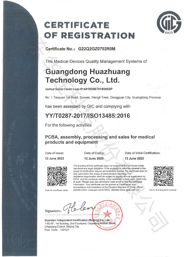 此次在公司領(lǐng)導(dǎo)的指揮及各部門積極配合下,經(jīng)過(guò)專家的全面、嚴(yán)格、細(xì)致的指導(dǎo)和審核確認(rèn)華莊科技質(zhì)量管理體系符合ISO 13485:2016醫(yī)療器械 質(zhì)量管理體系 的要求,獲得了GICG認(rèn)證ISO 13485:2016的證書,本次認(rèn)證范圍: 醫(yī)療產(chǎn)品及設(shè)備用PCBA.組裝加工與銷售。